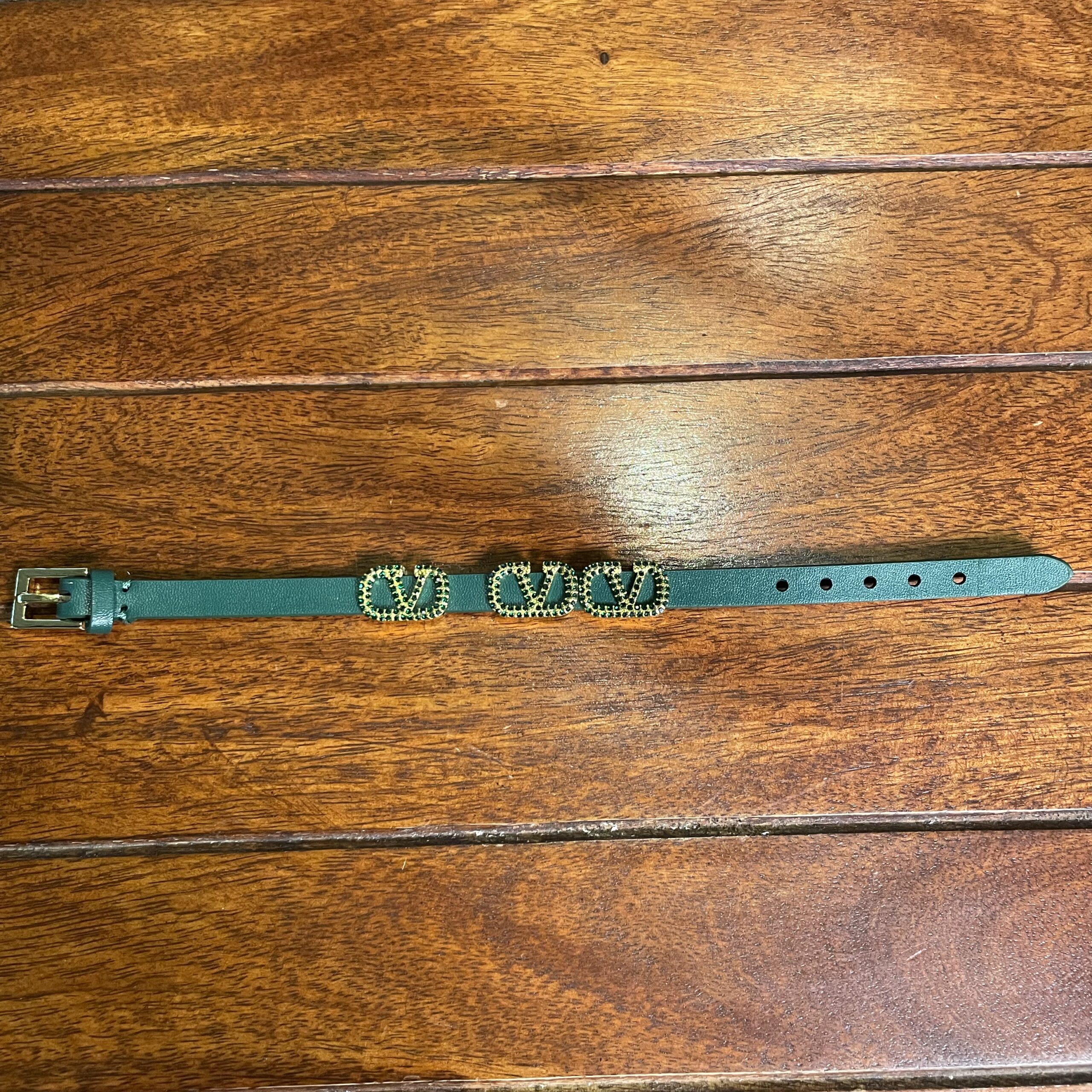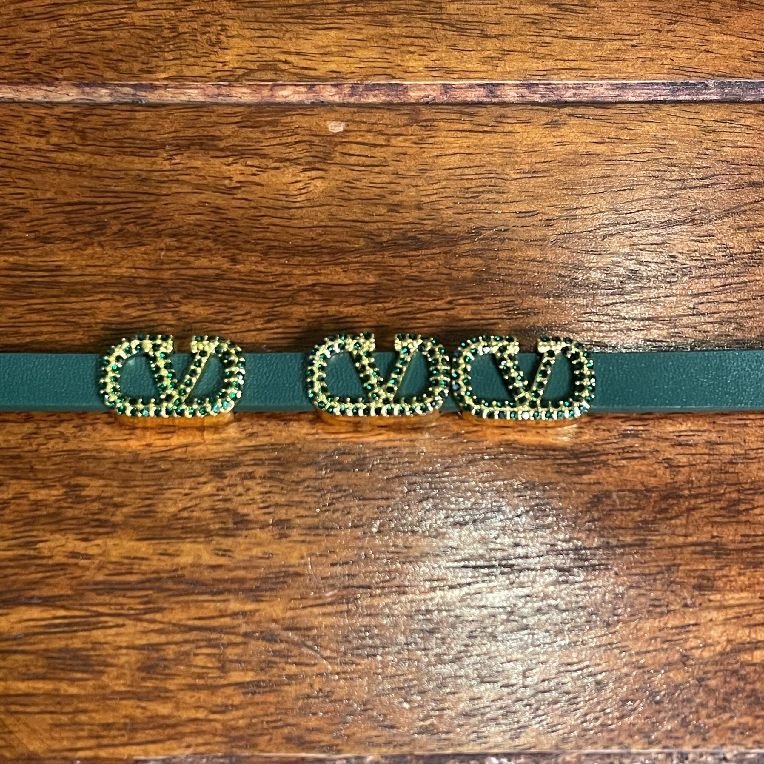 سوار أنيق بتصميم عصري مصنوع من جلد باللون الأخضر ، يتوسطه ثلاث قطع زخرفية ذهبية.
