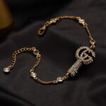 سوار ذهبي بتصميم أنيق مزين بتعليقة مرصعة بالكريستال اللامع، يمنح لمسة فخامة ورقي عند الارتداء.