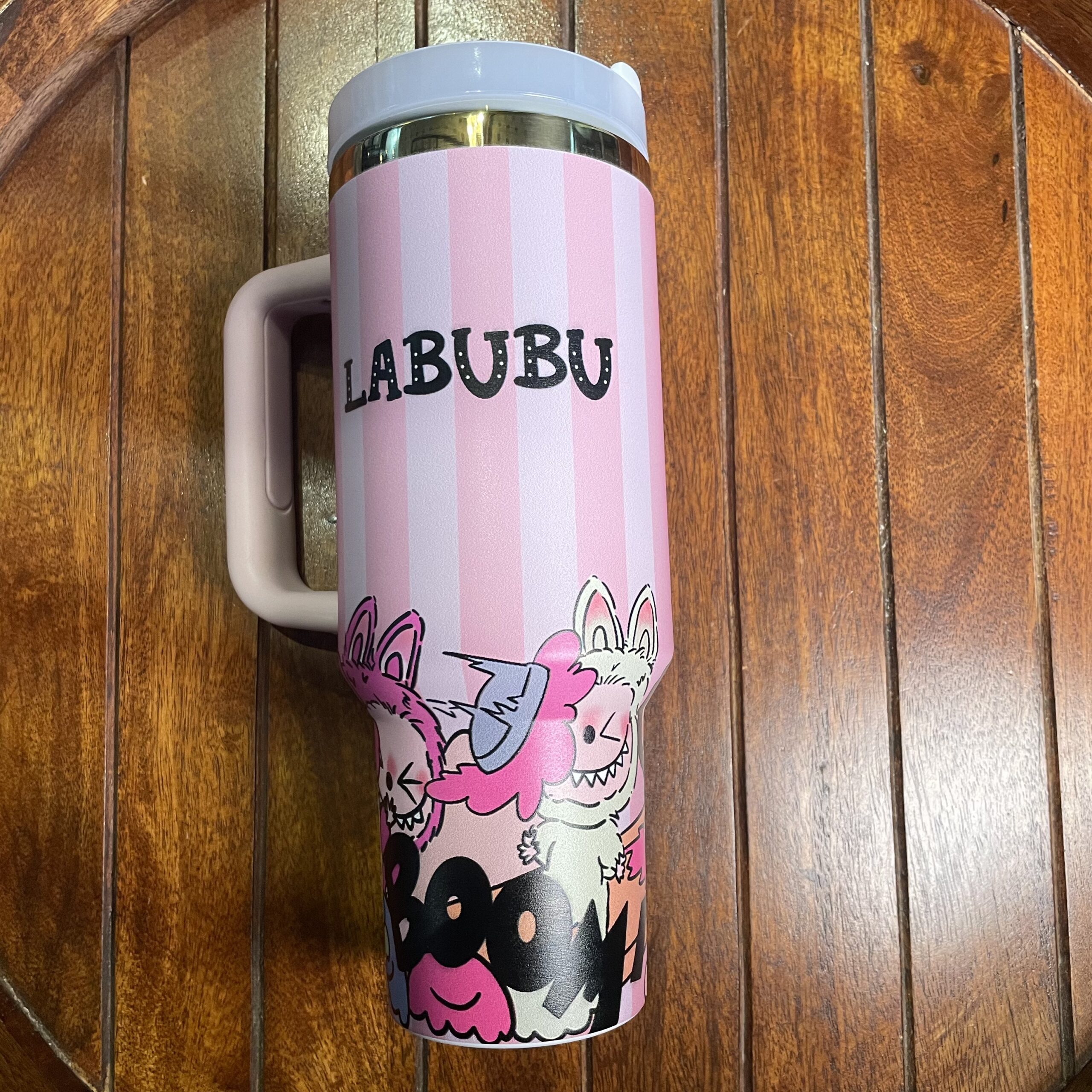كوب أنيق بلون وردي الغامق مخطط ب اللون الابيض مزين برسومات لطيفة تضيف لمسة مرحة ومميزة ليومك.