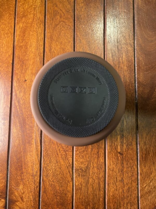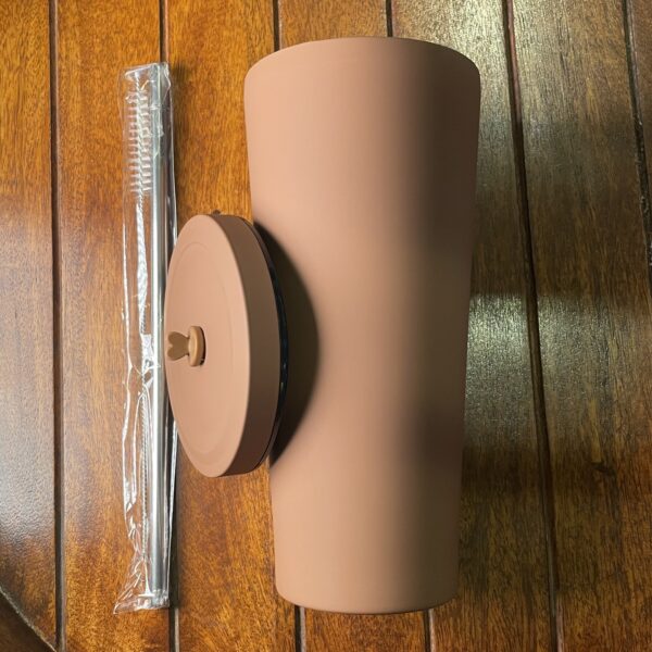 كوب حراري فاخر باللون البني المطفي، بتصميم أنيق وعصري سهل الحمل.