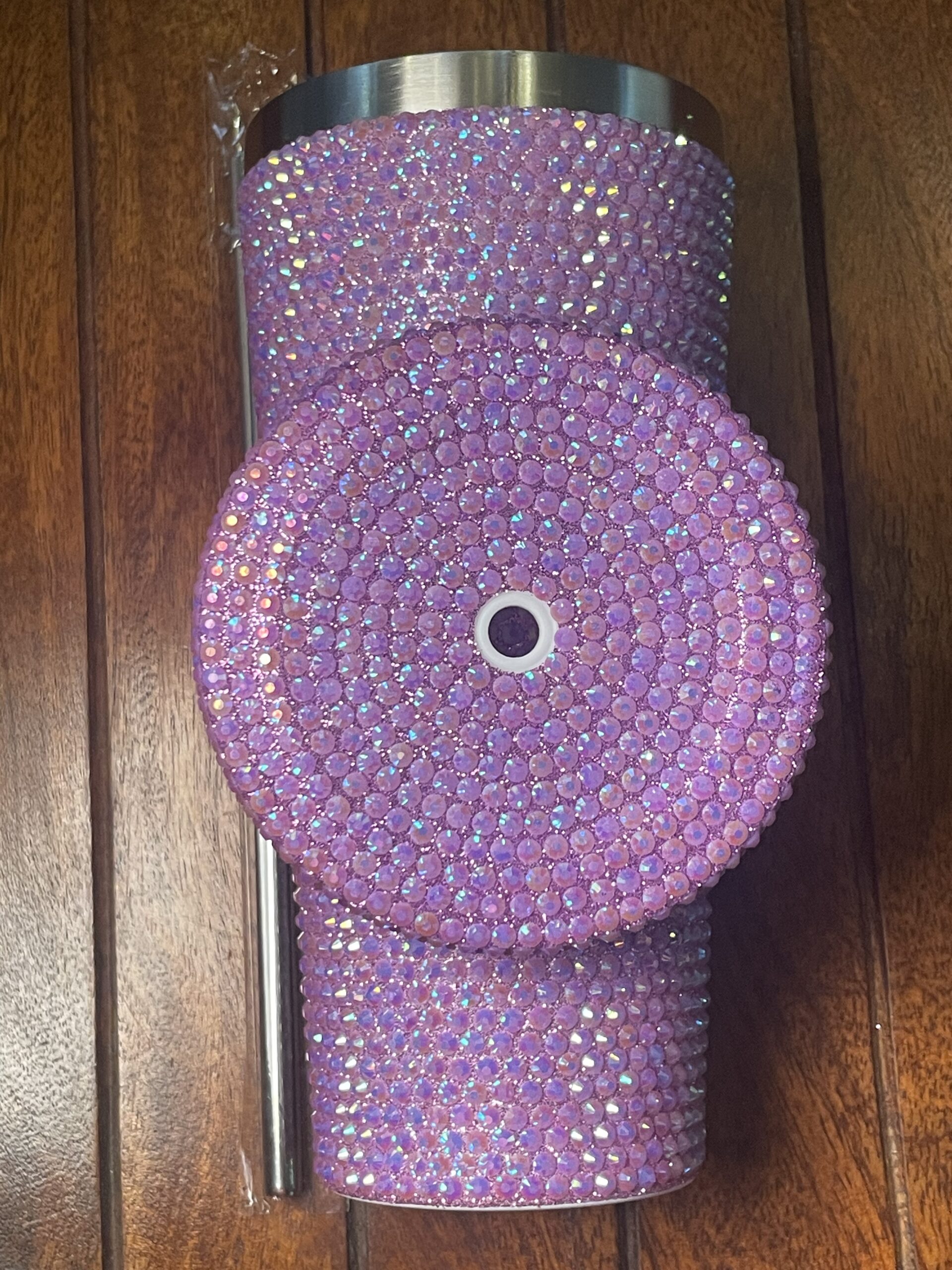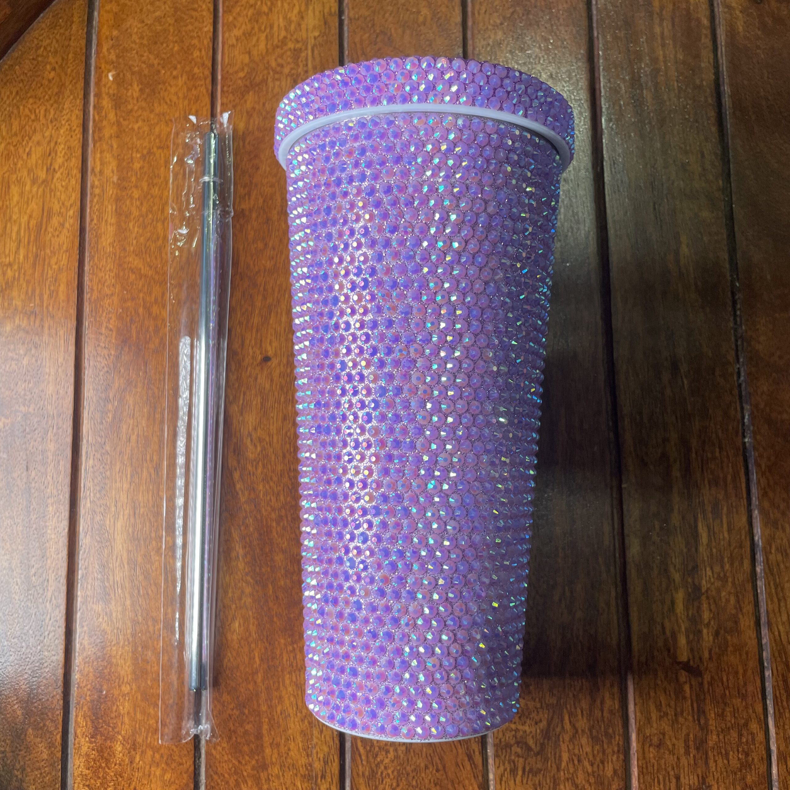 كوب أنيق مغطى بكريستال موف لامع، يجمع بين الفخامة والعملية، مثالي للاستخدام اليومي أو كهدية راقية.